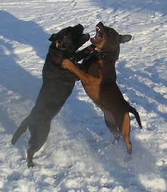 Naše Bunny od štěněte žila s kočkami a potkany, brala jsem ji do kravína, ke koním, běhala mezi slepicemi a můžu říct, že si ze žádného zvířete nedělá kořist. I venku na procházce pokud potkáme zajíce, tak jen stojí a kouká, nyní už bez tendence vyběhnout (to se nejspíš změní po dalším coursingu). K ostatním psům je dominantní a snadno se nechá vyprovokovat do šarvátky, ovšem při okřiknutí se stahuje. Největší problémy nastávají pokud jí chce jiný pes sebrat aport, a nebo když nezná styl stafbuličích her. Ty jsou totiž o dost jiné než třeba u labradorů. Stafbulíci při hrách vrčí, či produkují jiné zvláštní zvuky, které zpočátku ostatní psi nechápou a vznikne nedorozumnění.